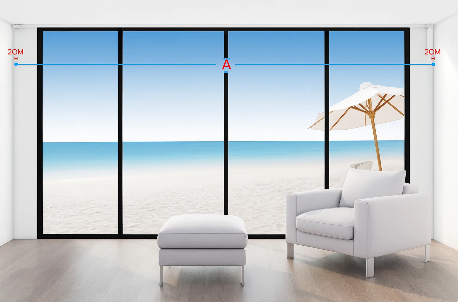 Full-wall width measurement (A) for a smart motorised curtain track across large sliding glass doors.