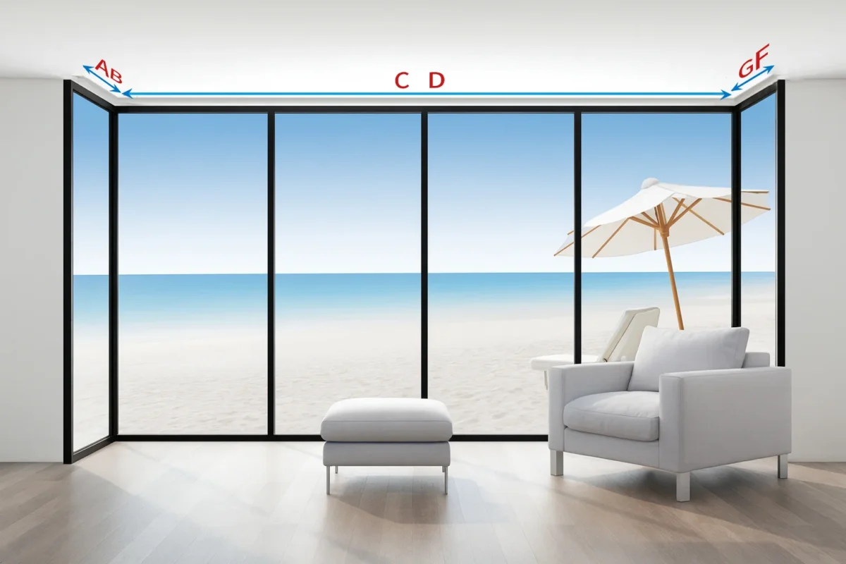 3D corner window with a beach view showing how to measure the top width from A–B–C for an L-shaped curtain track.