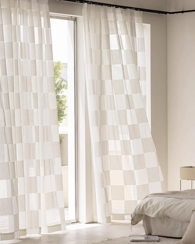 Block Stripe Sheer Curtain – Modern Soft Beige Check Voile Drapes