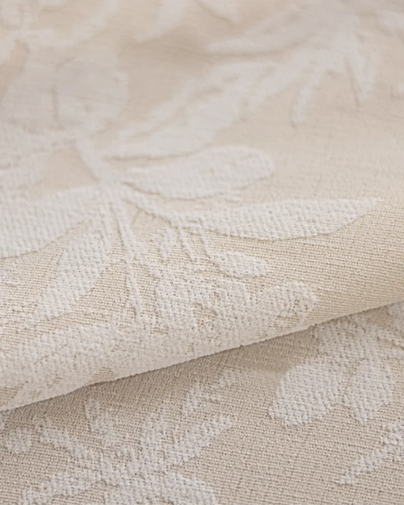 Fabric: Beige floral jacquard sheer with soft botanical pattern