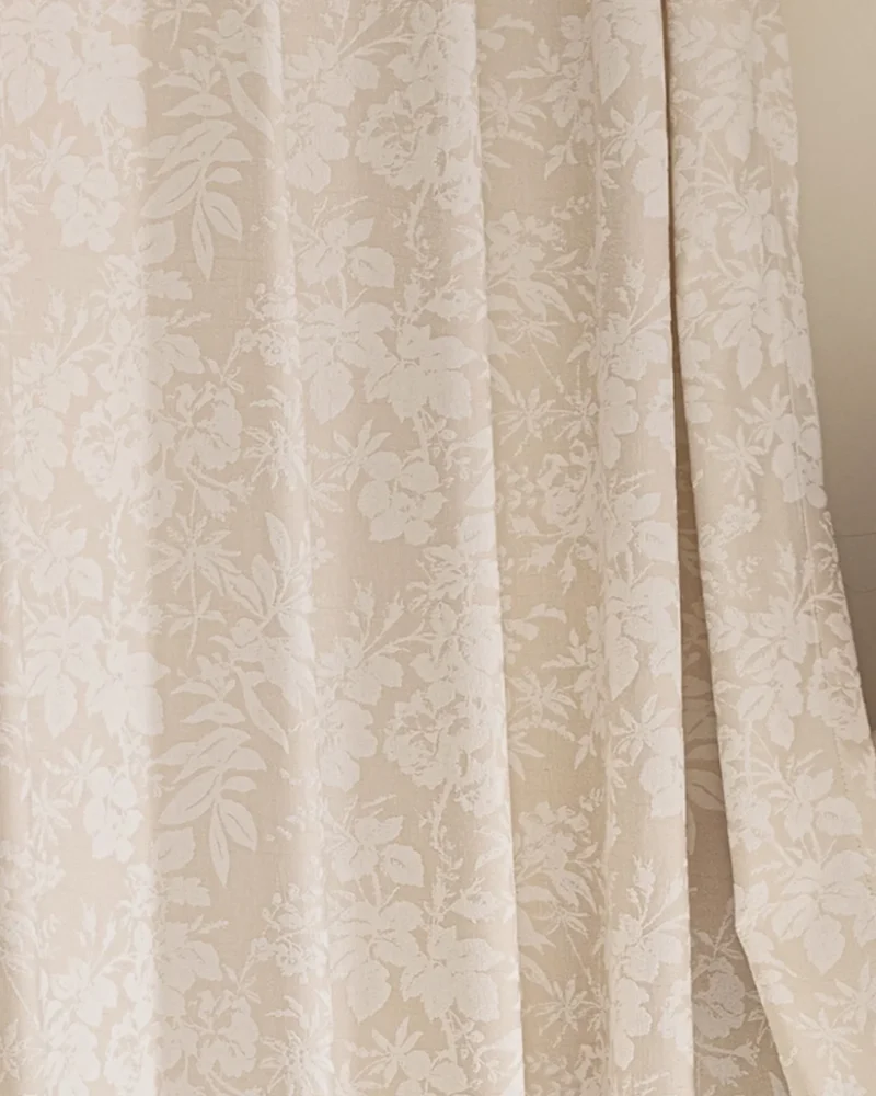 A fine jacquard weave creates a subtle all-over floral pattern that catches the light in a gentle way. From a distance, Blossom Whisper Sheer Curtain reads as a calm, beige sheer; up close, the botanical motif adds refined texture and visual depth—perfect for neutral, softly decorated interiors.