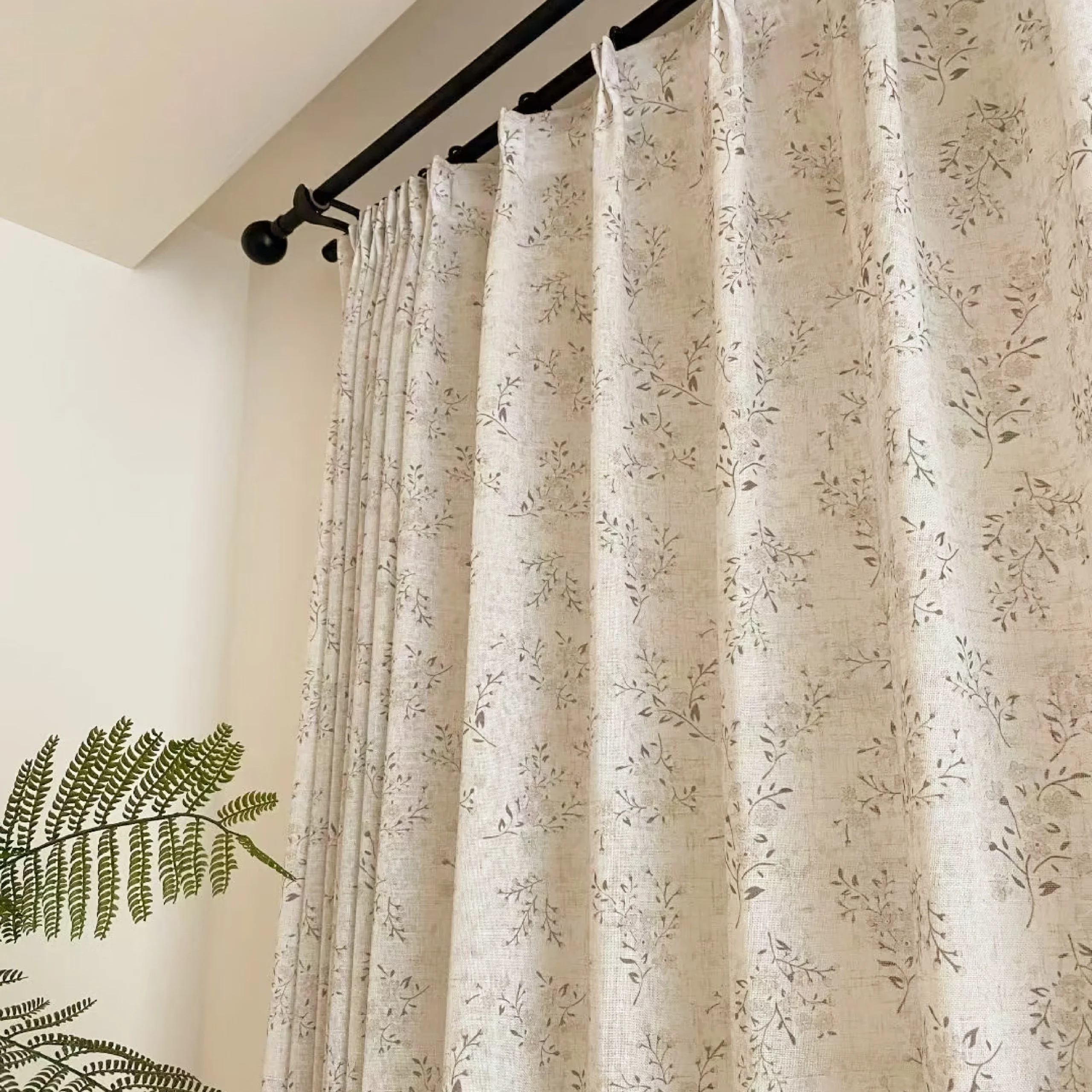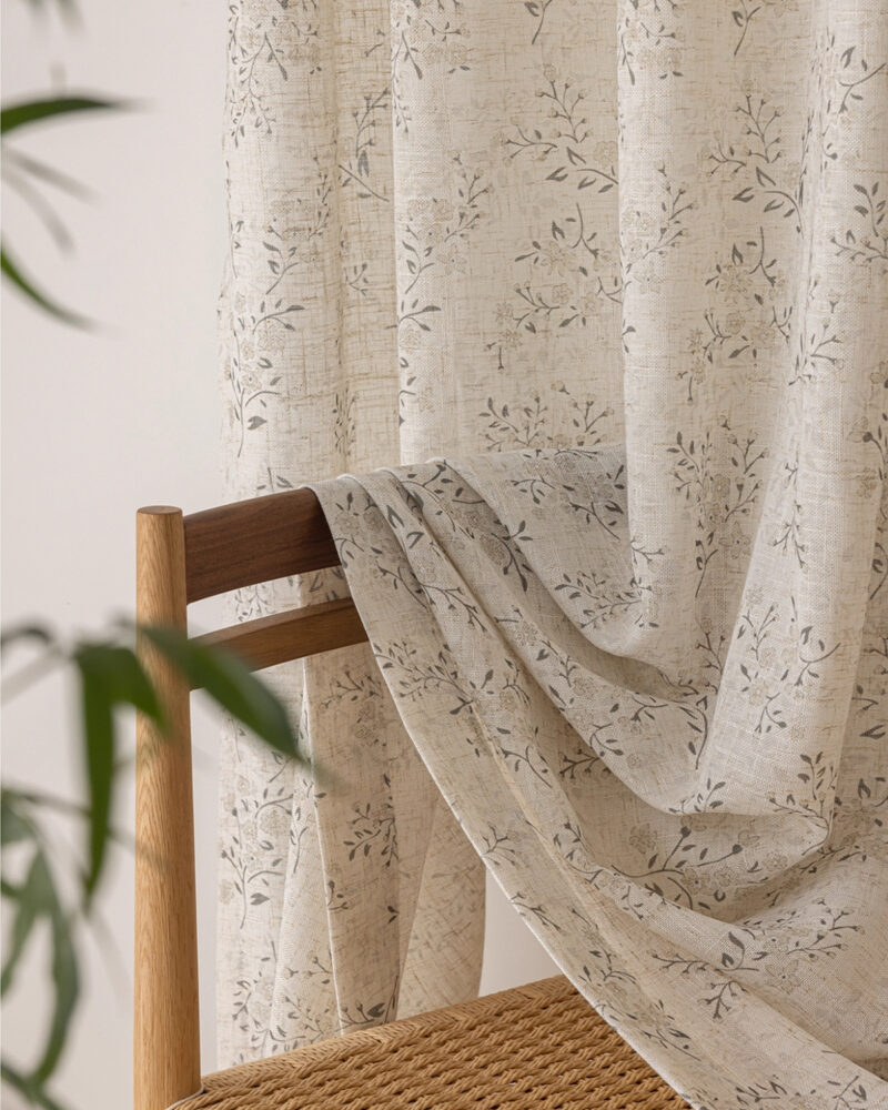 A refined all-over botanical pattern inspired by soft willow branches. From a distance it reads clean and minimal; up close it reveals gentle leafy detail. Designed as botanical linen look curtains, the print adds character without feeling busy—easy to style in modern, Japandi, coastal and cottage spaces.