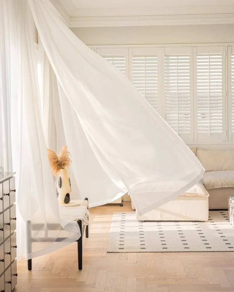 Cloudveil sheer curtain by Lemonho is a soft white sheer curtain in whisper-light voile that gently filters daylight while keeping your space bright and airy. Designed as a custom white sheer curtain for living rooms and bedrooms, it works beautifully on its own for daytime privacy or layered with blackout drapes at night. Custom sizes and multiple header styles (pinch pleat, wave fold, eyelet, adjustable hooks) make it easy to fit modern homes and designer projects, especially for custom sheer curtains in Australia.