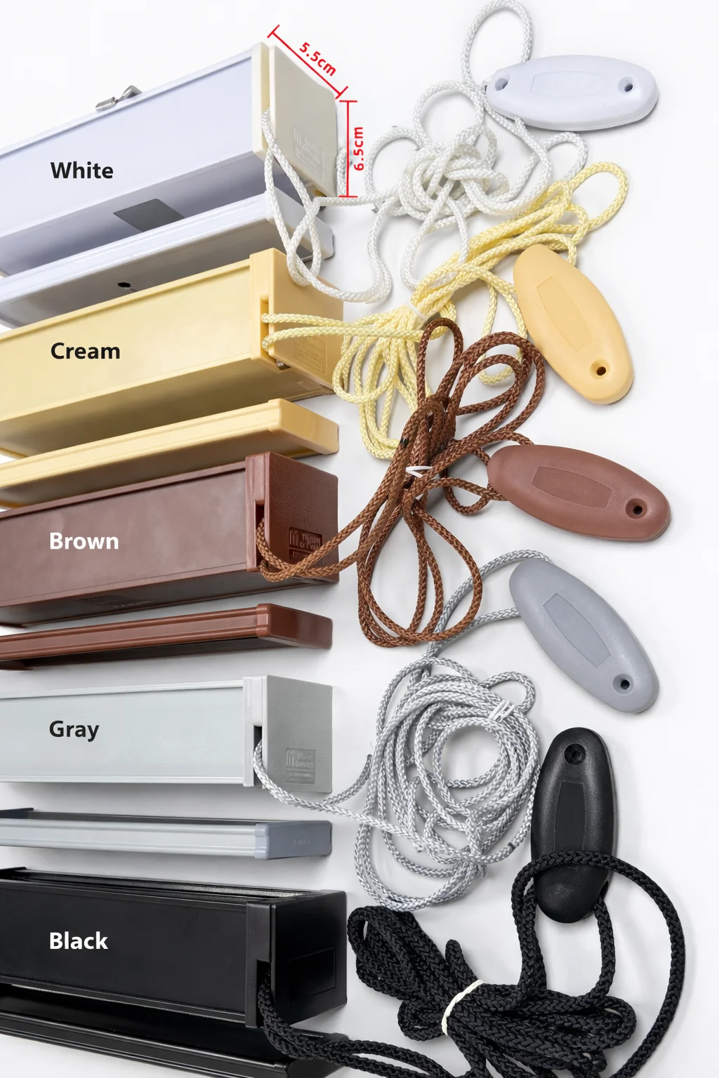 Wood blind headrail colour chart with matching pull cords and tassels in white, cream, brown, grey and black.