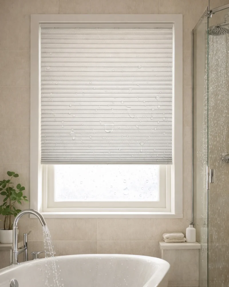 Designed for made-to-measure comfort, this semi-blackout waterproof honeycomb blind is ideal for spaces that need filtered natural light together with practical privacy and moisture resistance. When lowered, it helps soften incoming daylight, reduce glare, and create a brighter yet more comfortable indoor atmosphere. At the same time, it offers dependable privacy for everyday living while being well suited to areas where moisture resistance is important. It is especially suitable for bathrooms, kitchens, laundries, living rooms, studies, and other spaces that benefit from soft light control and easy-care practicality.